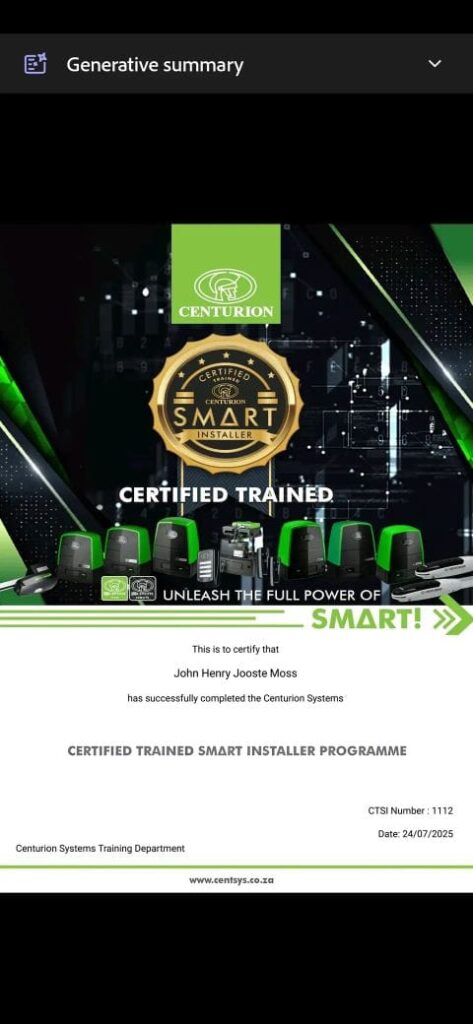 2) Certified for installing Alarm Systems, Gate operators & Garage Door Operators according to manufacturer specifications, by-laws, regulations & SANS Standards